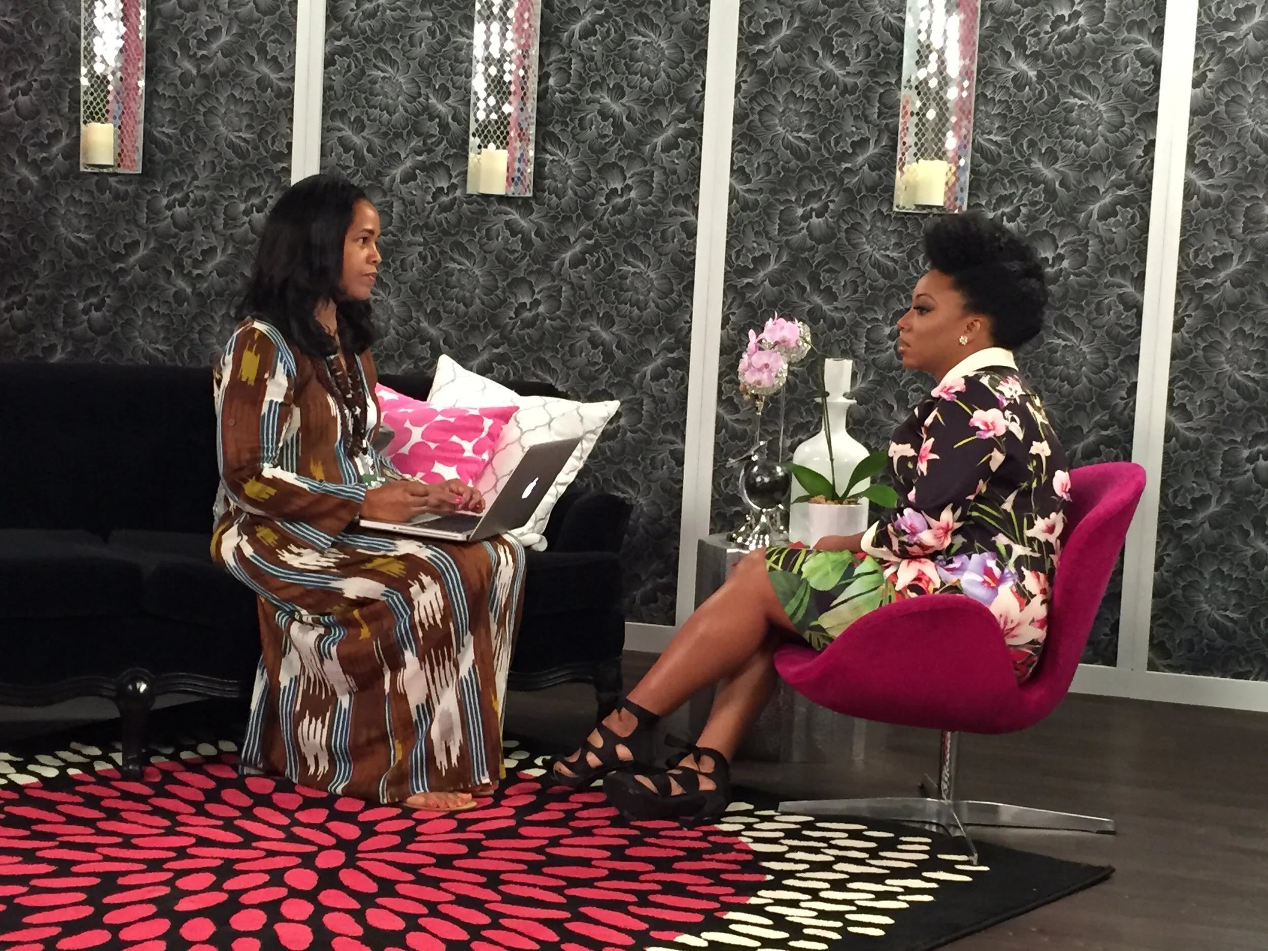 Prepping our host, Demetria Lucas D’Oyleye, on set in Los Angeles during the BET Experience.